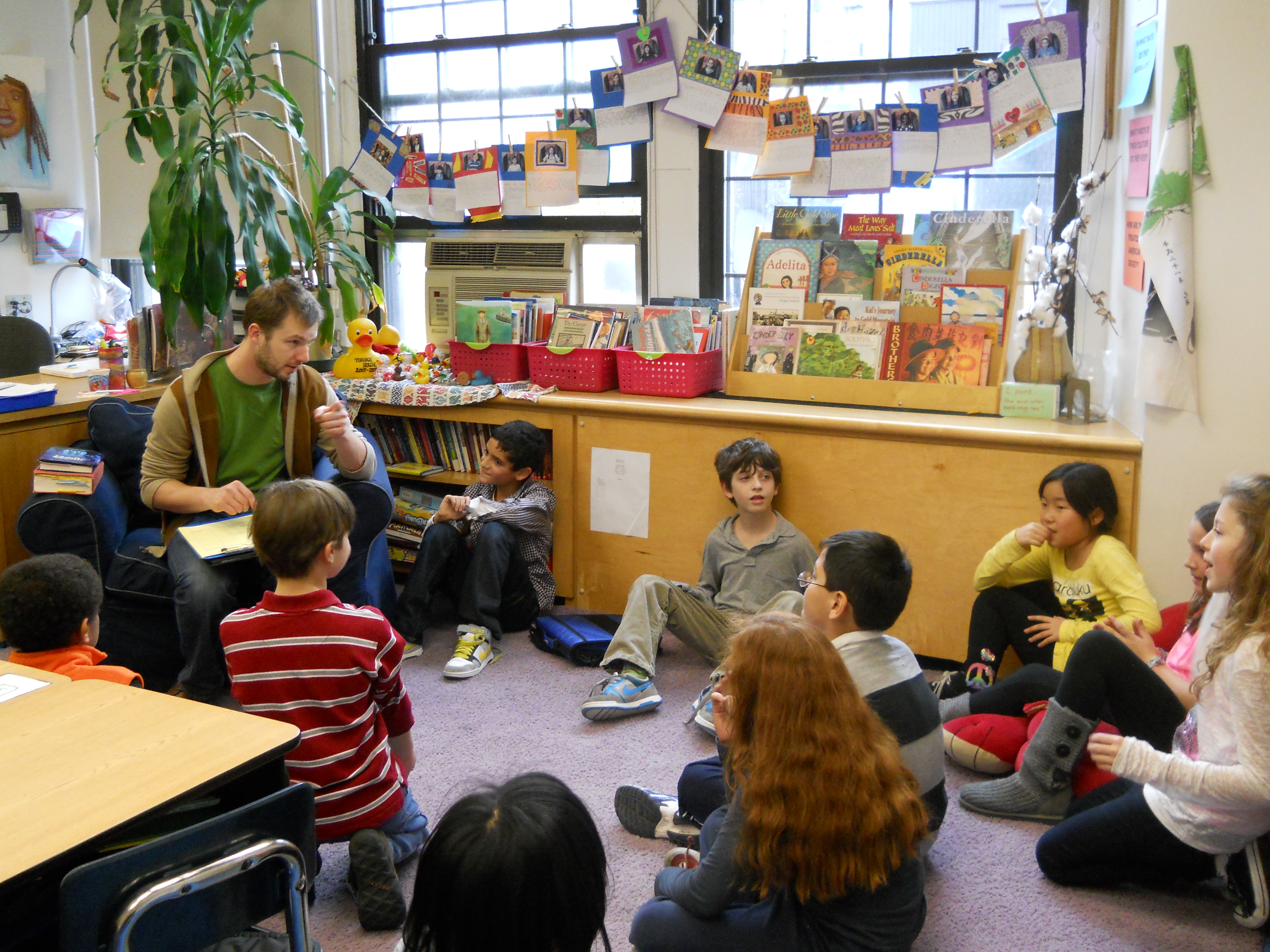 We are getting ready to write our very own versions of Cinderella and our minds are swimming with ideas about our characters, settings, and plots. Adam shared his experiences with the stories by the Brothers Grimm and told us about how he approaches retelling these stories. He actually likes to start, not with the beginning, but with what he feels is the most exciting part. Not only does it give him the energy to just start writing, but then he knows how to structure the beginning so that the exciting part makes sense. His advice? Make sure to build tension. Action without nail-biting, knuckle-whitening tension isn’t very exciting at all. Afterwards, he read the resulting tension filled moment from his book.
