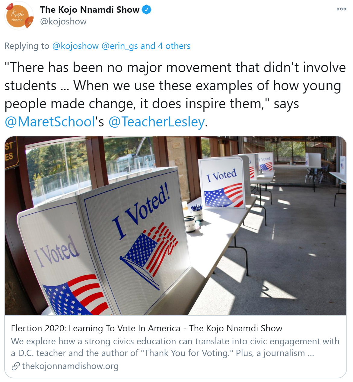 Depending on who you talk to, this Tuesday, November 3rd is either the end of our democracy, the second coming, or Kendall Jenner’s birthday. No matter which way they lean politically, this is the time for teachers to engage. I get the reluctance to touch this election in the classroom with even a ten foot pole. I was seriously tempted to duck and dodge the whole shebang. I did a large project in the spring with my former 6th graders around the primaries, but I was feeling overwhelmed this fall and secretly hoped someone else would do it. Then I was invited back to The Kojo Nnamdi Show to talk about elections and civic education, and as with all reflective experiences, I was reminded of my duty as an educator to serve my students first, even when it is uncomfortable or hard.