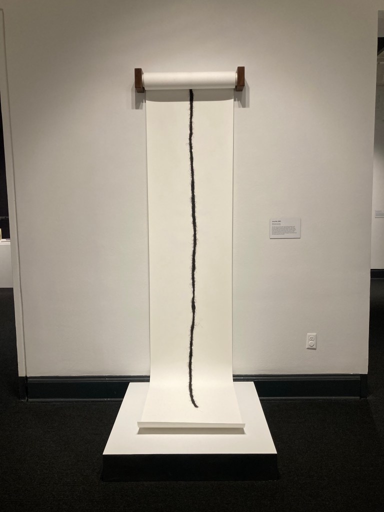 I could go on and on about the many pieces that showcase the depth of your intellectual inquiry, commitment to historical and cultural exploration, and highly detailed attention to craft, materials, and processes. But I am not an art historian or curator or artist and my words would not do your work justice. So I will share my experience of just one piece: Long Hair (2005). A single loc, photographed, printed, and rolled on a 30 foot scroll.