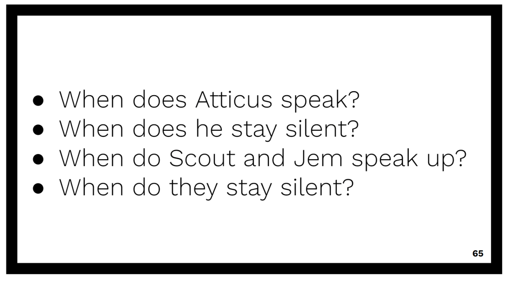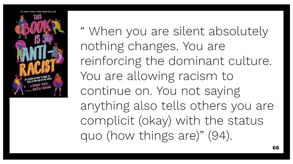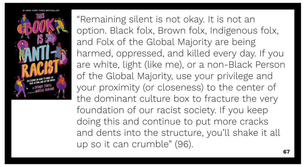 Our all middle school read this year was This Book is Anti-Racist as part of the preparation for our annual Day of Dialogue. It is a gem of a book that clearly guides young people through important concepts and terminology. Tiffany Jewel actually did a virtual book visit as part of the day, which was lovely. It was extremely helpful that so many students were primed to talk about race and use related vocabulary. In particular, we were able to critique the messages Atticus gives to Scout about the language and racial slurs she is exposed to. Using quotes from the book, we examined scenes where different characters speak up or stay silent.