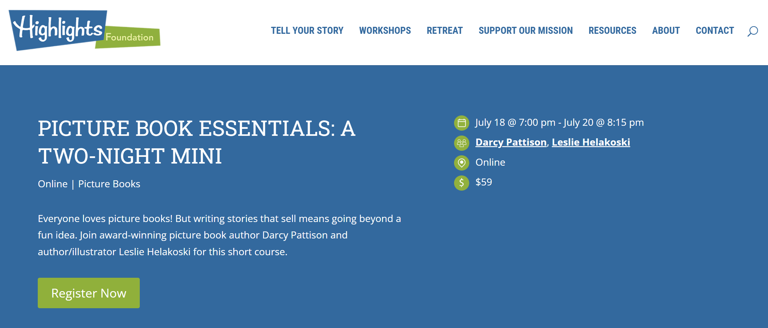 Who else got Highlights magazine as a child? Well, they have an entire foundation dedicated to supporting people who write for children. In addition to retreats and workshops at their idyllic Pennsylvania headquarters , they have great online programming at the introductory level. This two night mini workshop July 18 – July 20 would be a great first step.