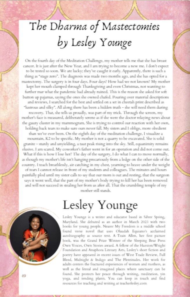 A prose poem, “The Dharma of Mastectomies” was placed in Spoken Black Girl Magazine. It is about my mother’s breast cancer treatment. I know so many women who have or have had breast cancer – way too many. Let’s get our mammograms and hold each other in the light.
